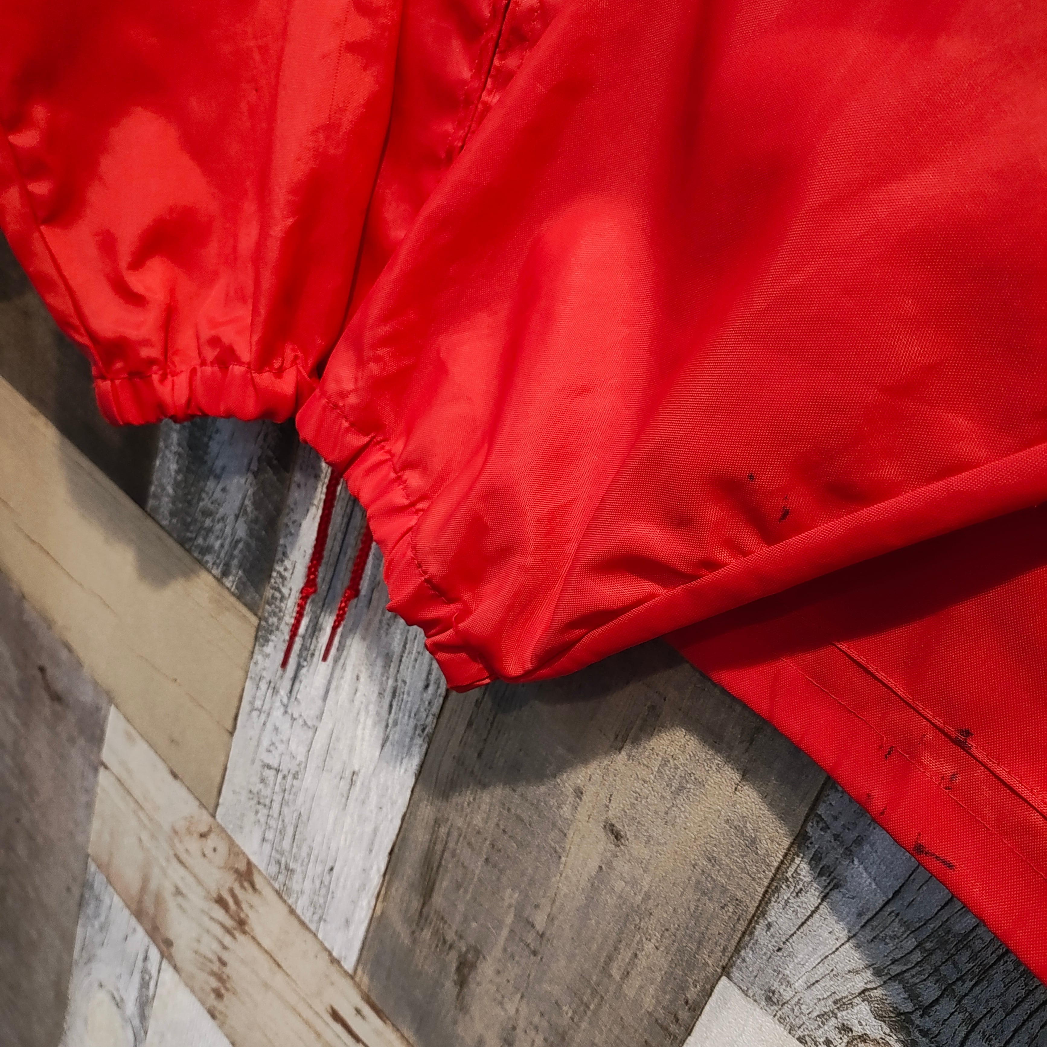 光沢のある赤のナイロンにホワイトのラインがぐっときます。