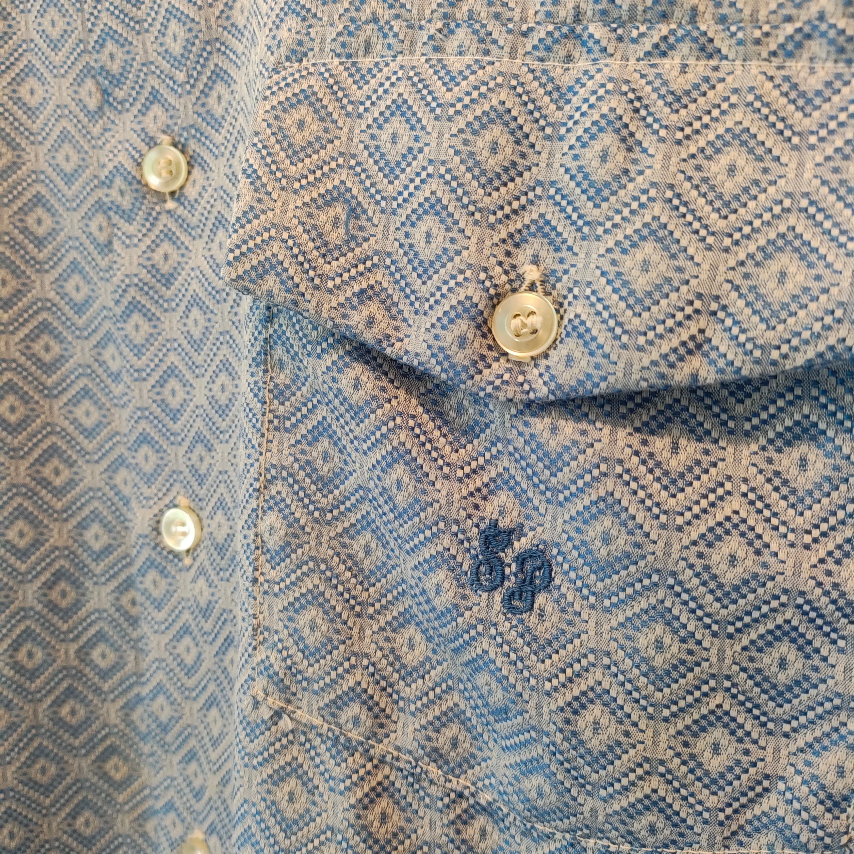 ポリコットン素材でブルーの糸に光沢があり、ボタンダウンながら少しドレッシーな印象。